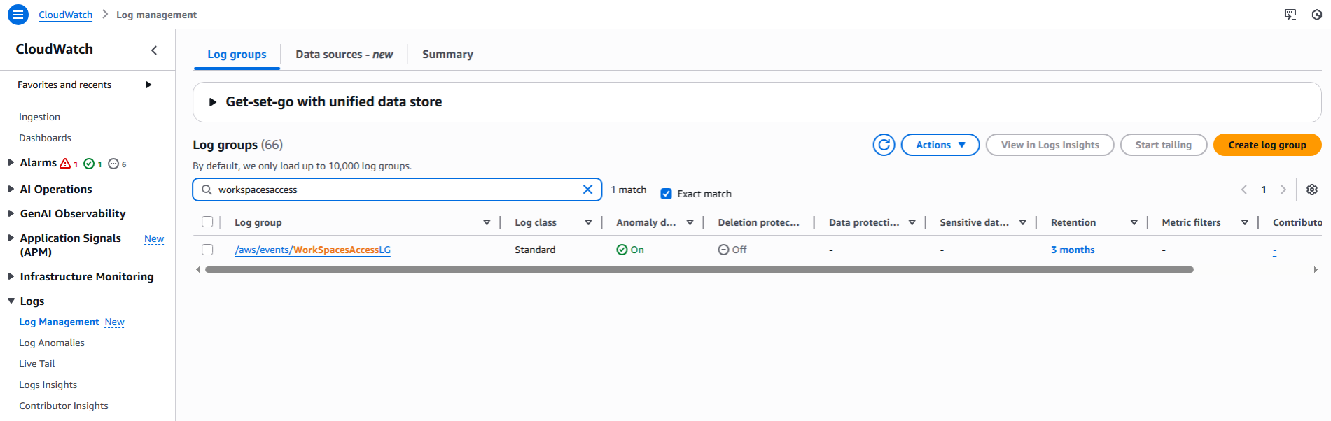 * Log Group: <mark style="color:red;">**"/aws/events/WorkSpacesAccessLG"**</mark>