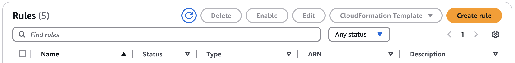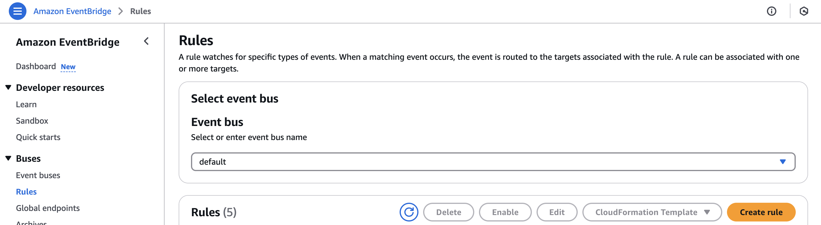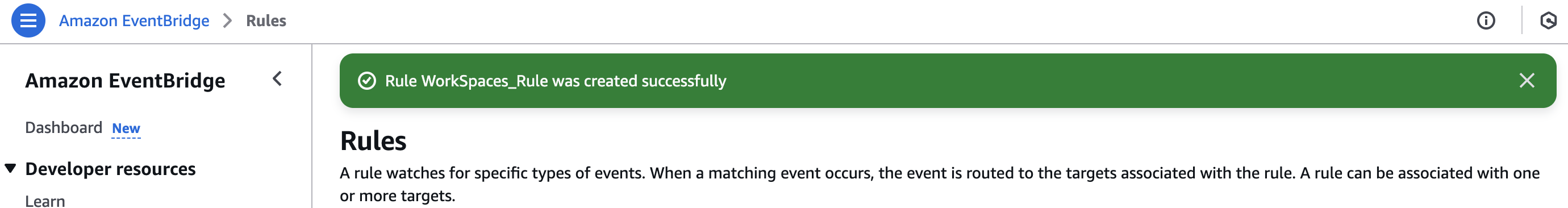 To create new **Rules** and a **CloudWatch Log Group** in a different region from where WorkSpaces Manager was deployed via the **CloudFormation template**, navigate to EventBridge. Click on "Buses" > "Rules":