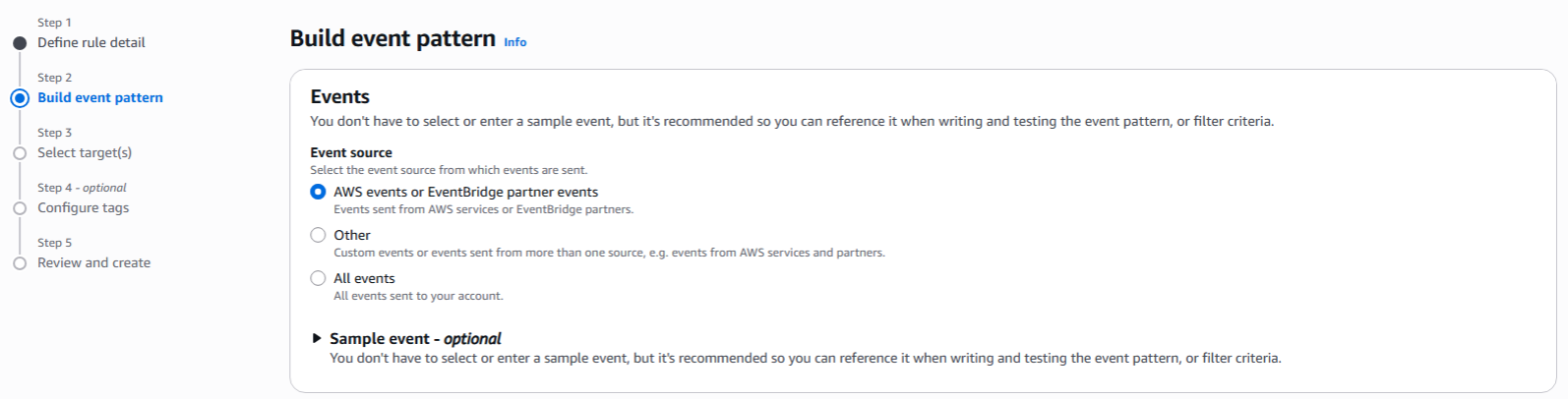 In the **"Events"** section, select **"AWS events or EventBridge partner events"**: