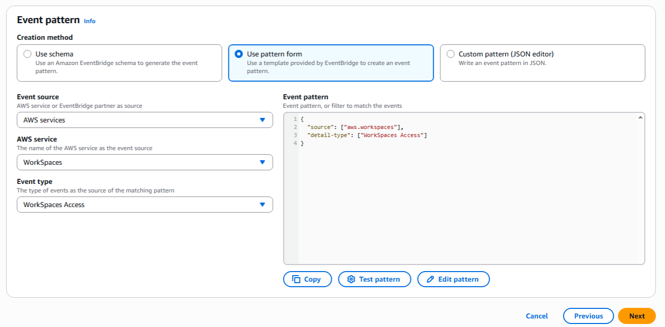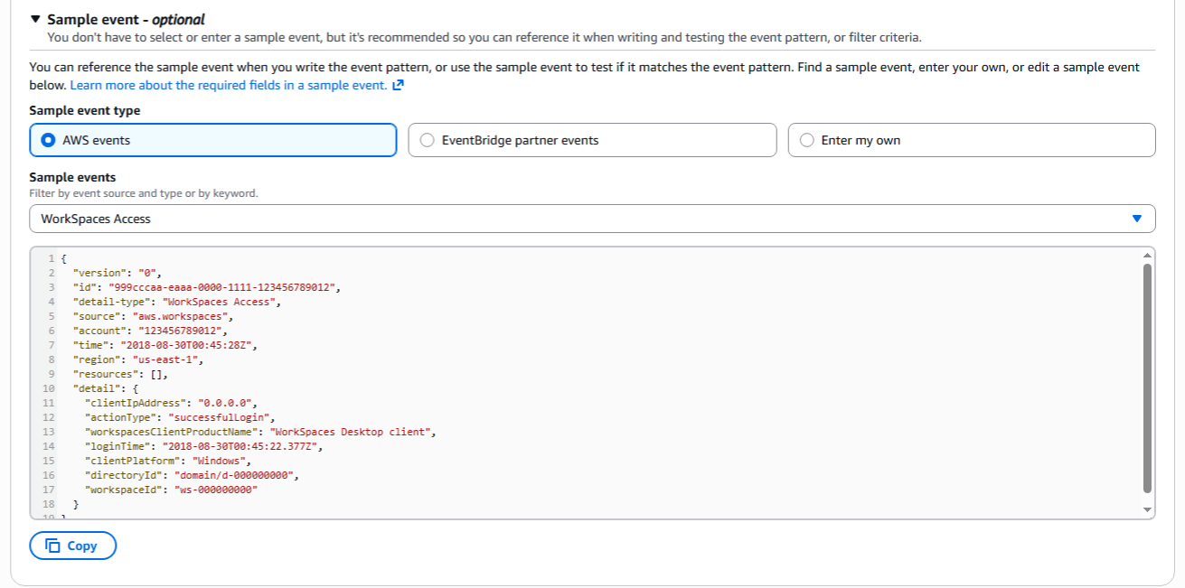 Below, in the **"Sample event - optional"** drop down, select **"AWS Events"** and search for **"WorkSpaces Access."**