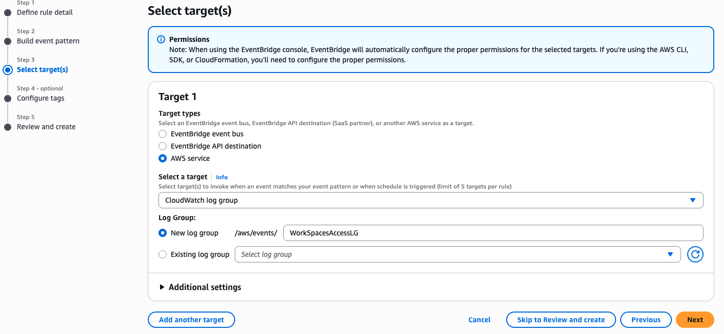 The **CloudFormation template** for **WorkSpaces Manager** in the **AWS Marketplace** automatically creates an **EventBridge Rule** and a **CloudWatch Log Group** in the same region where the appliance is deployed. The default **CloudWatch Log Group** is called: <mark style="color:red;">**"/aws/events/WorkSpacesAccessLG"**</mark>