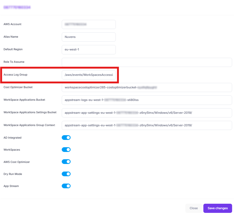 Now, in WorkSpaces Manager, click on the **“Configuration”** drop-down, select **“Settings”**, and then **“Amazon Web Services”** Scroll down to the Account settings and select account, fill in the **“Access Log Group”** field with the following information: `/aws/events/WorkSpacesAccessLG`.